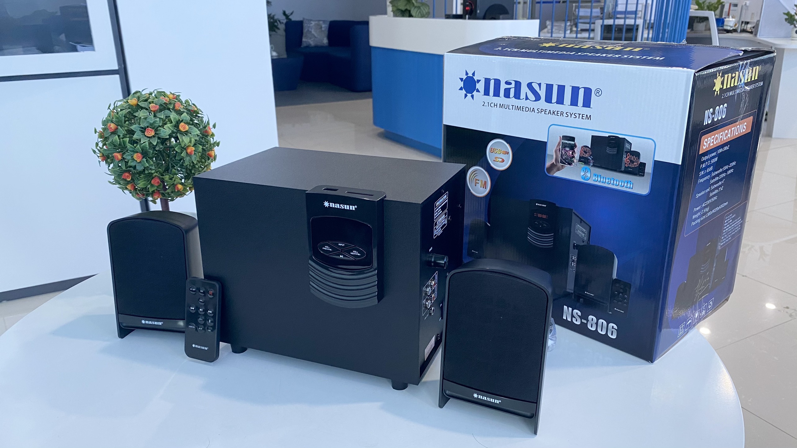 ● Nguồn điện: AC 220V, 50Hz ● CÔNG SUẤT TỔNG 20W (Loa chính 10W(RMS)+5W(RMS)*2 loa nhỏ) ● Sai lệch đáp tuyến biên độ tần số âm tần từ: 55Hz-220Hz, 220Hz-18KHz. ● P.M.P.O: 500W. Tỷ số tín hiệu trên tạp âm (S/N): ≥65dB ● Méo phi tuyến âm tần: ≤0.3%, 1W 1KHz ● Kích thước loa siêu trầm: 4" - L150xW235xH190 (mm) ● Kích thước loa vệ tinh: 3"x2-L80xW85xH120 (mm) ● Chức năng: AUX-IN (Cắm dây loa 3.5") / USB / thẻ nhớ SD / Bluetooth / Đài FM ● Điều khiển: Điều khiển từ xa / Các nút bấm điều chỉnh mặt trước / Núm Bass mặt sau ● Tên Bluetooth để kết nối là "NS-806" ● Trọng lượng: 2.5kg